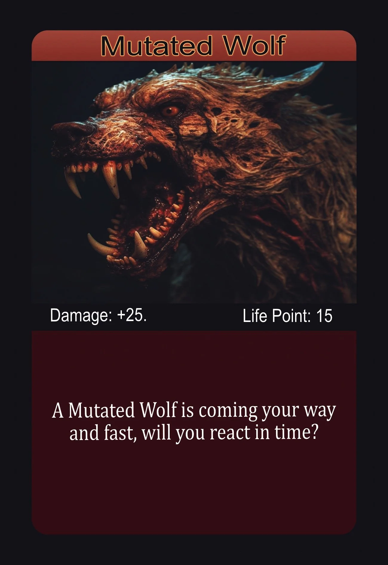 The game is played with two types of cards, “Movement” cards and “Action” cards. Movement cards make players advance in the scenario and Inside the action deck cards, supplies and weapons can be found but also enemies. Meaning whenever a player draws an action card, there's a chance an enemy will appear and attack. The player involved in the encounter flips a coin to play heads or tails and the winner gets the first attack.