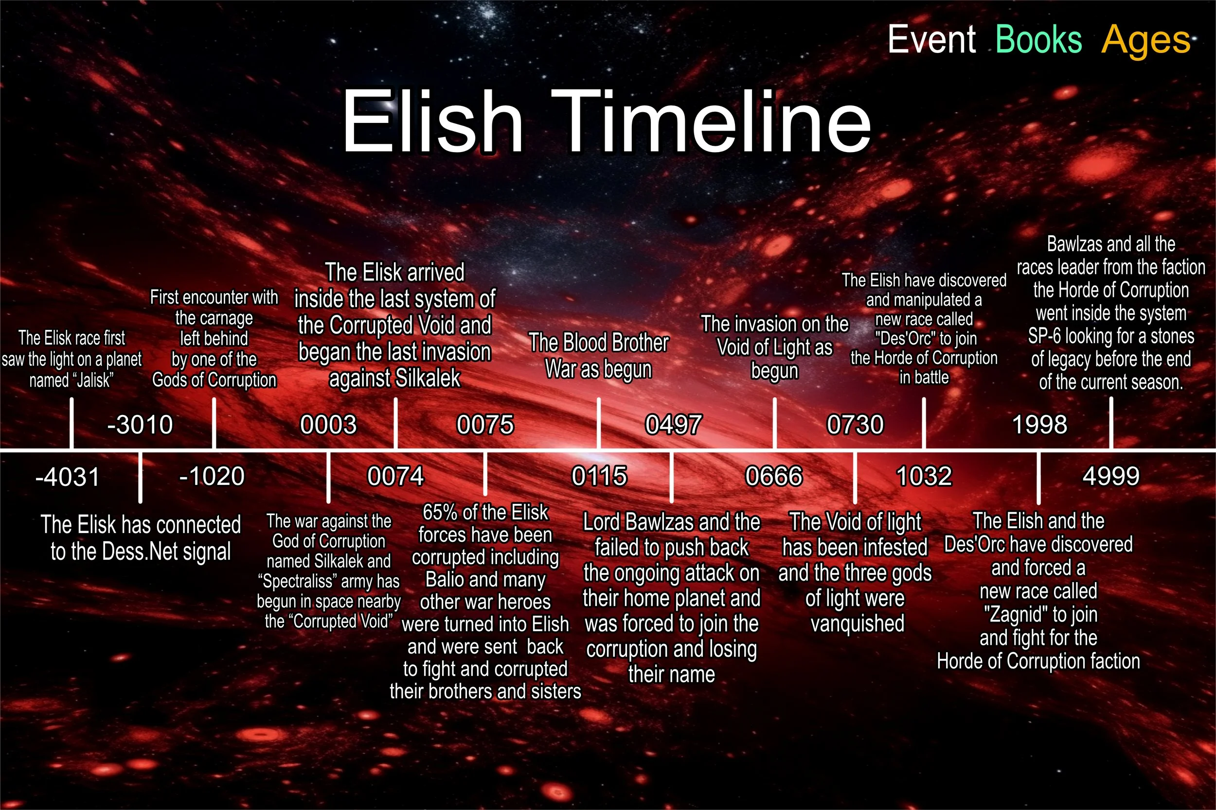 2000: The Elish race sent 35 billion souls into numerous galaxies the support the ongoing conquest and help in searching for the Prossawin species or any other race created by the Forces of Light.