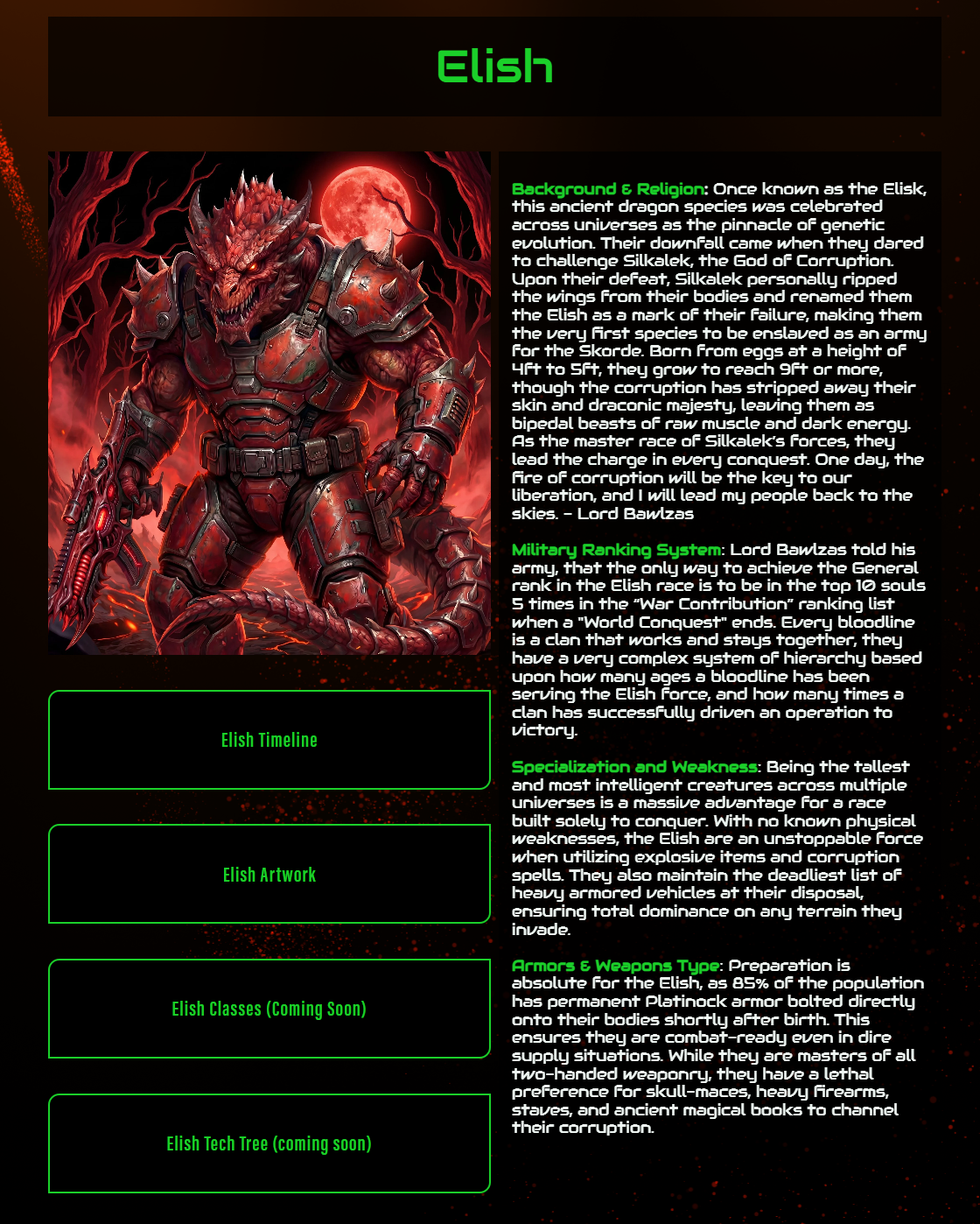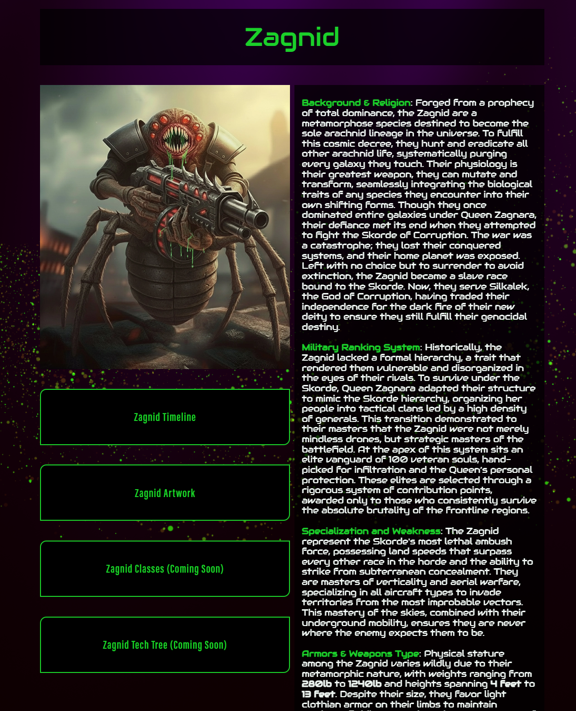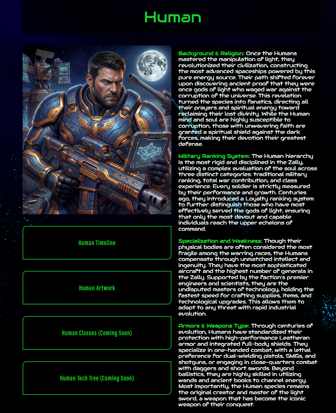 The 8 core species of Planet Warz have been fully redefined. This major update covers everything from their Background & Religion to their Military Ranking Systems, Specializations, and Armors & Weapons Type.